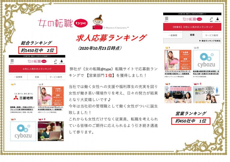 これからも女性だけでなく従業員、転職を考えられている皆様のご期待に応えられるよう引き続き邁進して参ります。